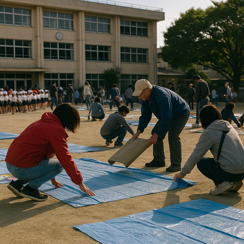 家族連れがキャンプ用の椅子やシートを手に、学校の限られたスペースを求めて集まる様子が見られました。