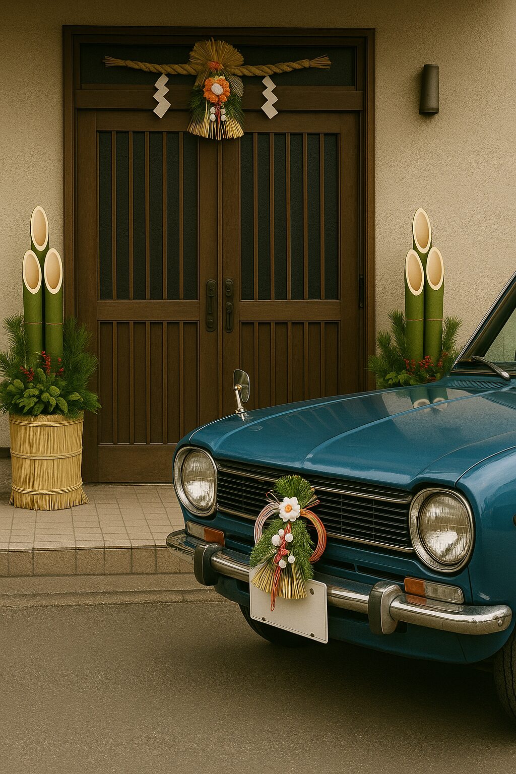 また、当時の日本では、自家用車が正月装飾の一部として活用されることも珍しくなく、フロントグリルにしめ縄や正月飾りを取り付けることで、新年を祝うための象徴的な存在とされました。