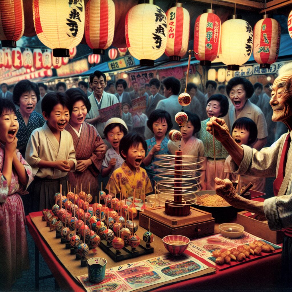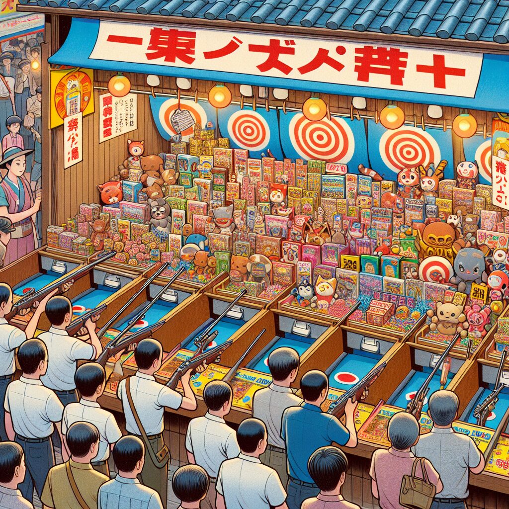 昭和の時代、お祭りの夜に射的屋台は賑わい、子供たちはお小遣いを握りしめて景品を狙いました。