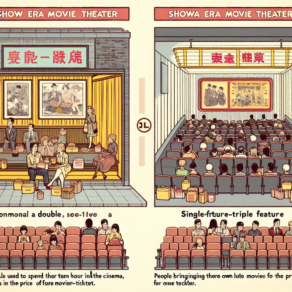 また、昭和の映画館には入れ替え制がなく、観客は自分のペースで映画を楽しむことができました。このため、映画館で一日を過ごすことが珍しくなく、観客はお弁当を持参して、午前中から映画館に入り浸ることもよくありました。このようにして観客は、自分の好きな映画を何度も観ることができるだけでなく、異なる作品を楽しむことも可能でした。映画館での一日は、ゆったりとした時間の中で過ごされ、映画の世界に没入することができたのです。