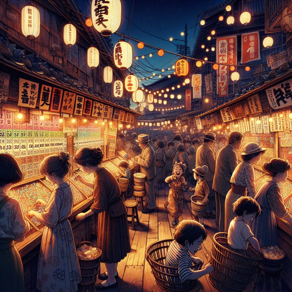 とはいえ、このような「がっかり感」や「ぼったくり感」も、昭和の夜店における味わい深い思い出として、多くの人々に楽しまれてきました。当時の子供にとっての夜店とは、単なるゲーム場以上の、特別な雰囲気を持つ場だったのでしょう。詐欺的といわれることもありましたが、この一風変わった経験は、夜店の醍醐味を感じる瞬間でもあるのです。こうして考えると、昭和の夜店くじ引きは、その時代の文化的な一部として、今なお人々の記憶に生き続けています。