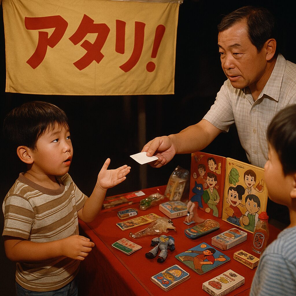 とはいえ、このような「がっかり感」や「ぼったくり感」も、昭和の夜店における味わい深い思い出として、多くの人々に楽しまれてきました。当時の子供にとっての夜店とは、単なるゲーム場以上の、特別な雰囲気を持つ場だったのでしょう。詐欺的といわれることもありましたが、この一風変わった経験は、夜店の醍醐味を感じる瞬間でもあるのです。こうして考えると、昭和の夜店くじ引きは、その時代の文化的な一部として、今なお人々の記憶に生き続けています。