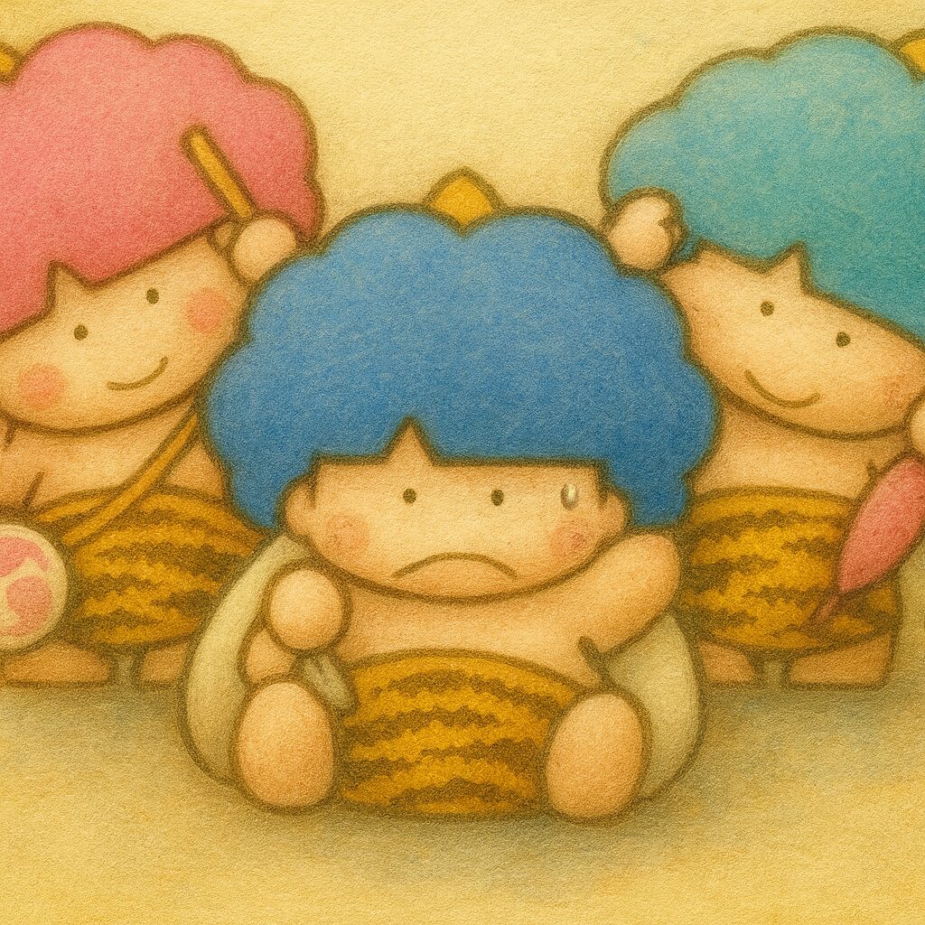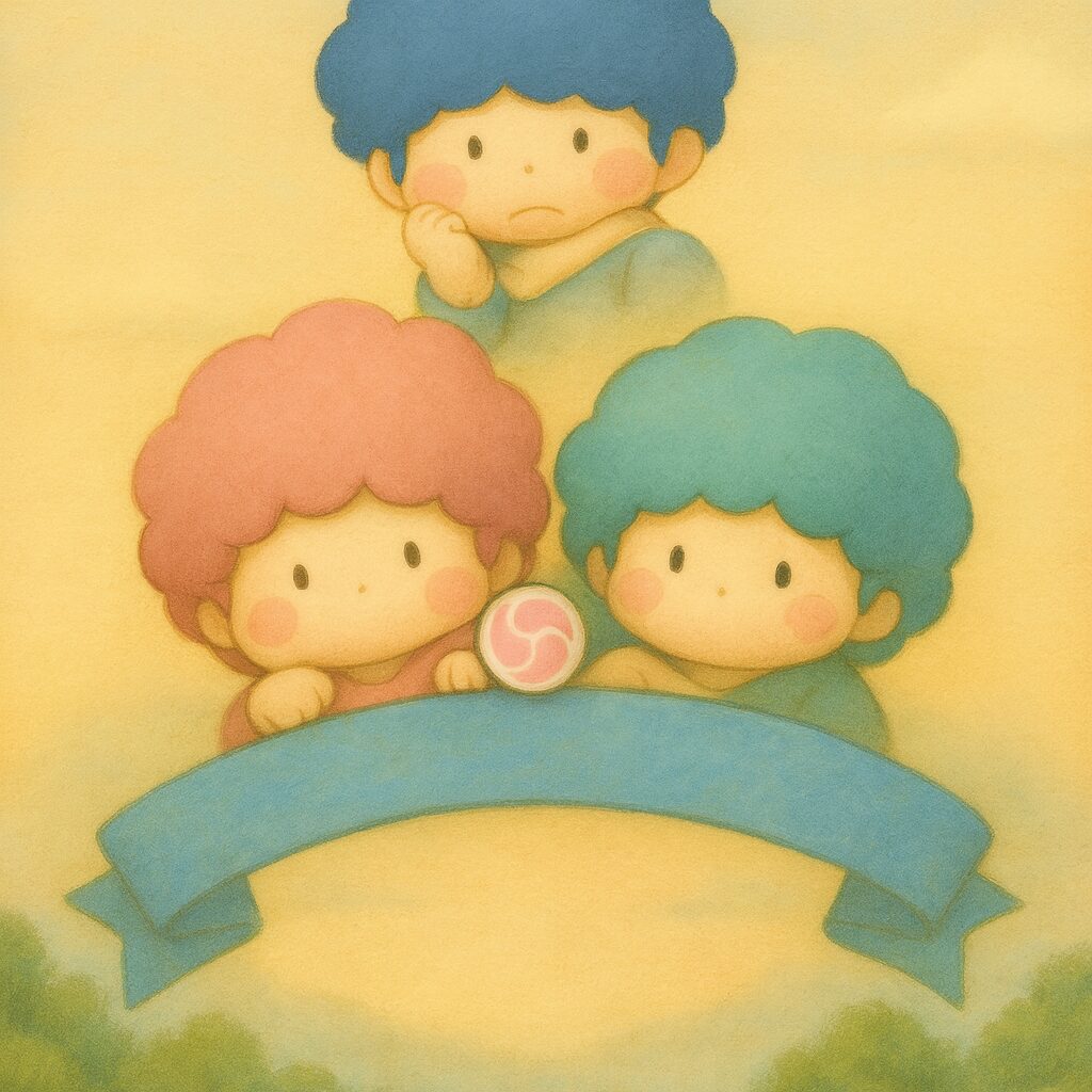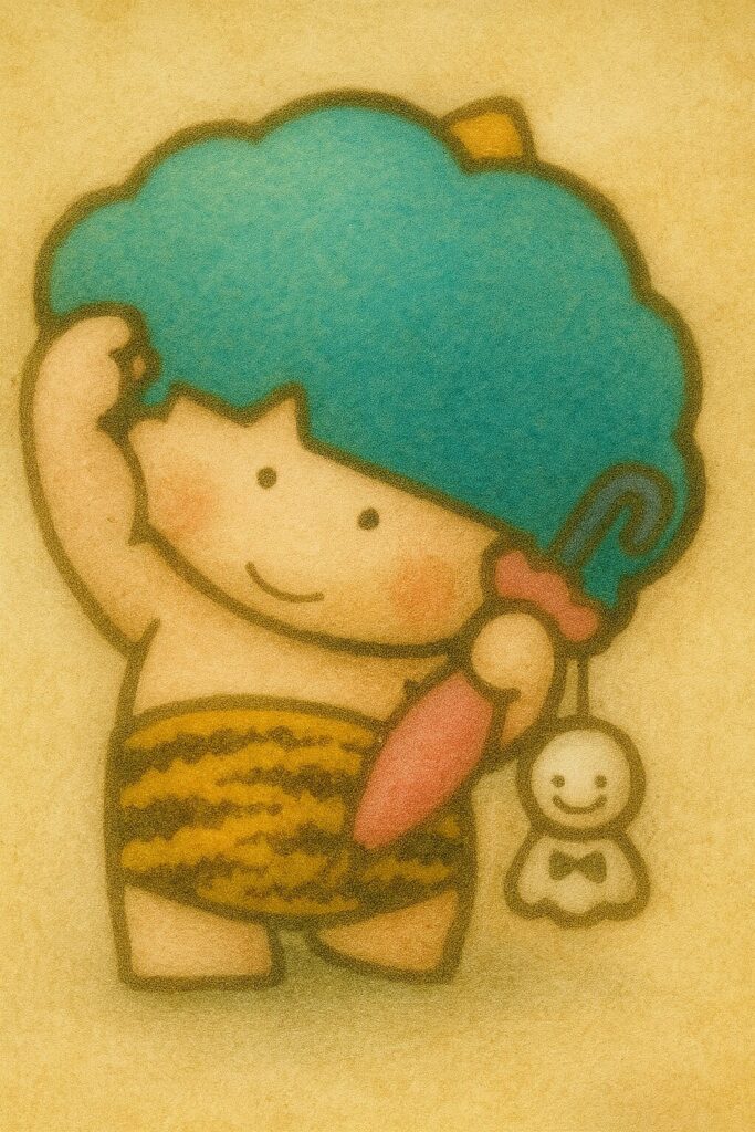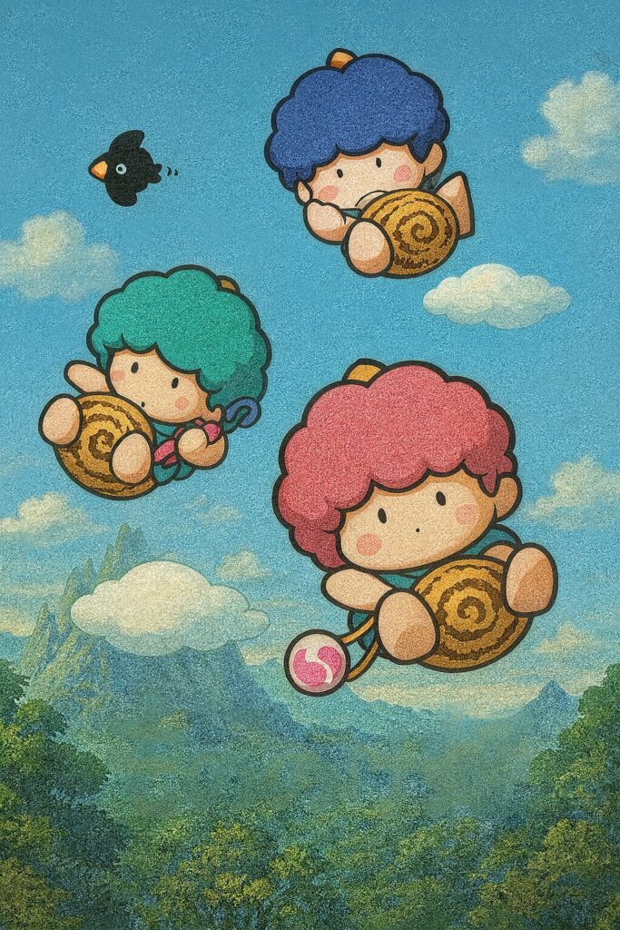 日本の昭和末期から平成初期にかけて、大きな人気を博したこのキャラクターたちは、青、ピンク、緑の3色で表現される個性的な雷の子どもたちです。