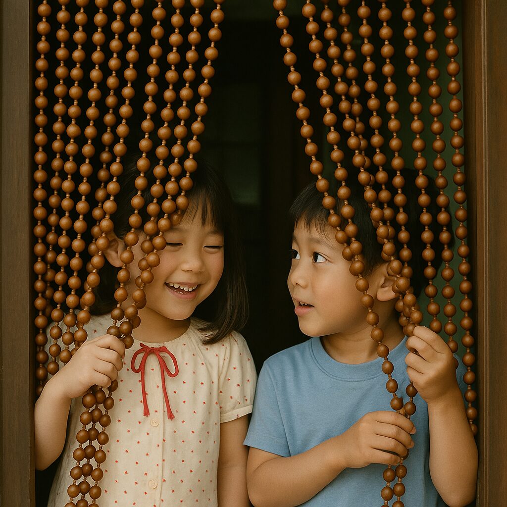 玉暖簾を通過する際に、勢い余って体や顔に珠がぶつかることで、思わず「痛っ!」と叫んでしまうのは、昭和時代の子供たちにとっての共通の経験でした。また、子供たちはその触感を楽しむこともあり、指で珠をいじくり回したり、自分なりの遊びを創造したりしました。例えば、珠を使って静かに三つ編みを編んでみたり、その珠で手品のようなことを試みたりと、玉暖簾はただのインテリア以上に、子供たちの創意工夫の場でした。