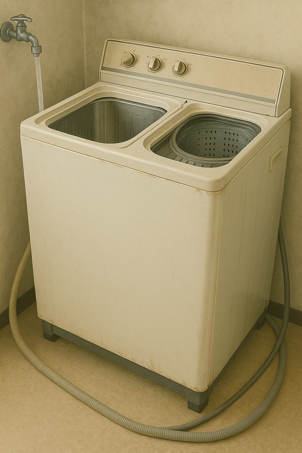 この振動音は二層式洗濯機の特徴で、昭和の家庭の一コマを象徴しています。